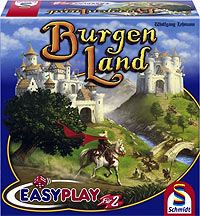 „Easy Play für 2“ nennt sich die neue Reihe, deren erstes Spiel Burgen Land heißt. Die Ausstattung des Spiels ist recht üppig, man hat ein Spielbrett, 57 Karten und sieben Würfel zur Verfügung. Und die Spielanleitung ist gar nicht so „easy“. Sondern sie beschreibt einen nicht unaufwendigen Spielablauf.