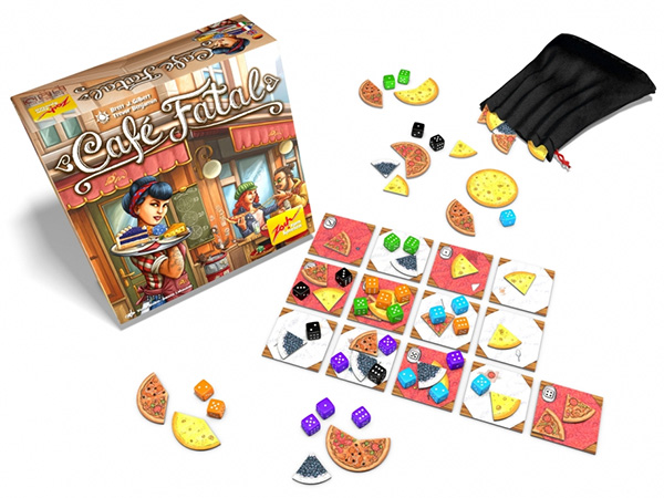 Café Fatal erinnert an Vegas, wo man die Würfel im Casino investierte. Auch hier im Café wirft man zunächst alle Würfel und muss sich dann für eine Zahl entscheiden. Diese Würfel werden dann komplett auf einen Tisch gelegt, auf dem sich Blaubeertorte, Pizza oder Käse finden. Einen Sechser-Zwilling oder gar -Drilling würde man vermutlich auf einen Tisch legen, wo es um die wertvolle Torte geht.
