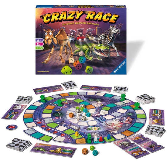 Nach jeder Zwischenetappe, vier Mal im Spiel, wird ein neues Zootier an meine Rennwagen gespannt. Das kann ein Gepard sein, der auch einen Würfelwurf in Höhe 12 akzeptiert. Der Elefant macht schon bei 4 schlapp. Zum Ausgleich haben scheinbar wenig leistungsbereite Tiere einen Nach-Zieleinlauf-Bonus. Plus acht Felder für den Elefanten. Ich empfinde diese Regelung als problematisch. Denn irgendwie wird damit der ehrliche Stellungskampf auf der Rennbahn entwertet. Wer es drauf anlegt, kann immer hinterherfahren. Und dann nach Spielende seine gesammelten Punkte auf den Tisch legen.