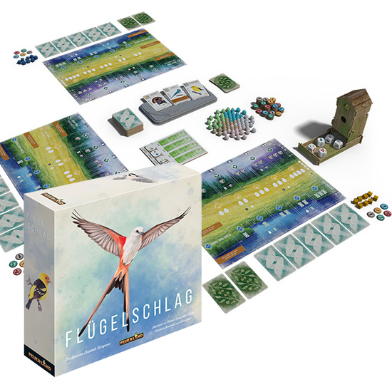 Jeder hat sein eigenes Tableau, auf das wir Spielkarten in den Wald, ins Grasland oder ins Feuchtgebiet legen. Jede Vogelkarte bringt je nach Wert der Karte unterschiedlich viele Siegpunkte. Außerdem können sie teilweise – was je einen Siegpunkt bedeutet – Futtermarker horten und andere Vogelkarten sammeln – gemeint ist auffressen. Da spielt ein Raubvogel, beispielsweise der Wanderfalke, Black Jack, deckt eine Karte vom Nachziehstapel auf, und wenn sein Opfer weniger als einen Meter groß ist (gemessen wird die Spannweite) verspeist er es. Der Glücksfaktor ist bei Flügelschlag nicht zu unterschätzen, er steht hier im richtigen Verhältnis zum taktisch-strategischen Anteil des Spiels.