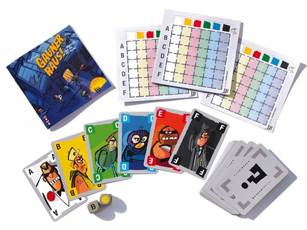 Cluedo ist der Urvater des kriminalistischen Deduktionsspiels, und auch bei Gauner raus geht es um Verdächtige und Räume – nur das Tatwerkzeug spielt keine Rolle. Gespielt wird bei Gauner raus nach dem Muster von Schiffe versenken. Gauner versenken wäre deshalb ein noch treffenderer Titel. Jeder Spieler bekommt einen eigenen Zettel vom Deduktionsblock, um dort Informationen über die Koordinaten der eigenen Gauner zu notieren. Den genauen Aufenthaltsort schreibt man nicht auf, denn der Zettel ist für die Gegner jederzeit einsehbar. Stattdessen werden einem Handkarten zugelost, je 12 im Zwei-Personen-Spiel. Farbe und Buchstabe der Karte zeigt an, an welcher Koordinate im sechs mal sechs Felder großem Gebäude sich der Gauner befindet.