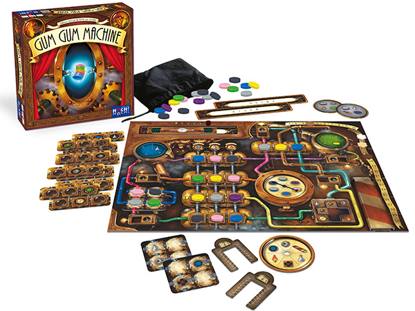 Industrielle Produktion als Thema für ein Brettspiel: das hört sich nach einem eher trockenen und ziemlich ernstem Konstrukt an. Die Gum Gum Machine, die das gesamte Spielbrett mit vielen Rohren und verschiedenen Apparaten einnimmt, ist hingegen eine höchst witzige Angelegenheit. Stefan Dorra und Ralf zur Linde werden bei der Entwicklung dieses Spieles und insbesondere der sehr unterhaltsamen „Betriebsanleitung“ einen Riesenspaß gehabt haben. Was ein Gum-Gum ist? „Es ist das Beste, was ihr euch vorstellen könnt“, ist zu lesen. „Es ist rund, bunt und jeder will es haben.“
