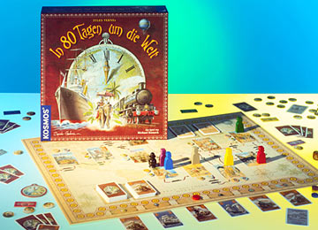 Das Spielbrett ist die Weltkarte. Wer schafft es am schnellsten einmal rund um die Erde – von London nach London? Doch Achtung: hier kann der letzte auch der schnellste sein. Denn die Tage, die man für die Reise braucht, werden auf einer Leiste reihum abgezeichnet. Dort, wo in anderen Spielen die Siegpunkte markiert werden, befindet sich die Zeitleiste. Wenn ich für eine bestimmte Teilstrecke eine Karte mit einem Schnelldampfer ausspiele, brauche ich nur vier Tage. Ein altersschwacher Schaufelraddampfer benötigt für die gleiche Entfernung acht Tage mehr.