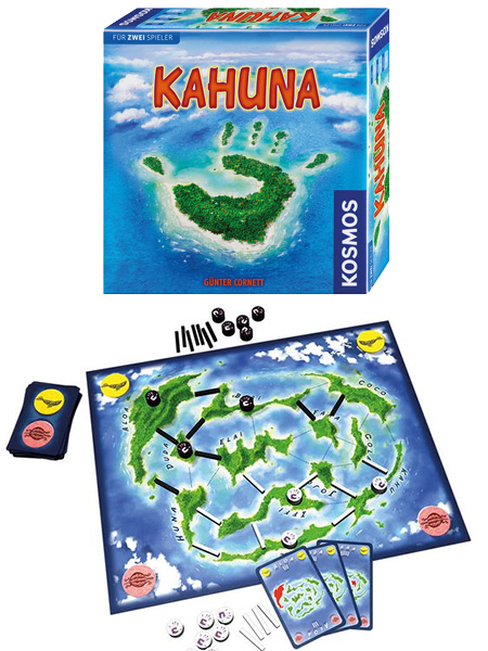Es geht darum, die zwölf Inseln einer Südseelandschaft mit Stäben in der eigenen Farbe zu verbinden. Wer die Mehrheit der Stäbe an einer Insel besitzt, bekommt dafür dann einen Kahuna-Stein, die bei den Wertungen die Punkte für den Sieg bedeuten. Die in der Minderheit verbliebene GegnerIn verliert dann alle ihre mühsam aufgebauten Verbindungen zu dieser Insel. Und damit Kahuna kein trockenes taktisches Denkspiel bleibt, bringen Spielkarten, die jeweils eine der Inseln bezeichnen, den Glücksfaktor. Erst das Ausspielen dieser Karten erlaubt einer SpielerIn, auf der jeweiligen Insel aktiv zu werden. Und wer gleich zwei Karten ausspielt, kann damit auch ein Verbindungsstäbchen der GegnerIn abreißen.