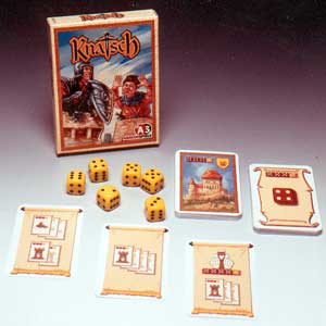 Knatsch: das ist Kniffeln mit Rittern und Burgen. Statt mehr oder weniger stumpf vor sich hin zu würfeln, inszeniert Michael Schacht mit sechs Würfeln und 56 Spielkarten einen spannenden Kampf. Erstes Ziel ist es, Karten zu erbeuten, die auf dem Stapel in der Tischmitte liegen. Auf jeder Karte steht, was gewürfelt werden muss. Es gibt beispielsweise eine Burgen-Karte, die einen Vierer-Drilling plus eine fünf kostet. Drei Mal darf man Würfeln, wobei die Sechser Nieten sind.