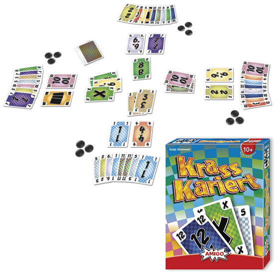 Krass kariert ist ein Stichspiel, bei dem es zunächst ziemlich egal ist, wer einen Stich gewinnt. Der wird nämlich achtlos beiseitegeschoben. Es reicht, wenn ich bedienen kann. Passen darf ich nur zweimal. Wenn ich das dritte Mal nicht bedienen kann, habe ich verloren und bekomme einen Strafchip.