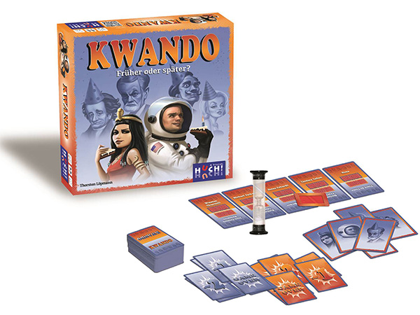 Kwando ist eine Kombination aus Anno Domini und dem Prominenten Tabu von 1993. Letztes ist nicht so bekannt wie das eigentliche Tabu, gehörte aber damals zu meinen Lieblingsspielen. Auch bei Kwando werden zwei Teams eingeteilt, die sich in knapp zwei sanduhrgestoppten Minuten untereinander die auf den Karten benannten Promis erklären. Das jeweils andere Team wacht derweil darüber, ob Fehler gemacht werden.
