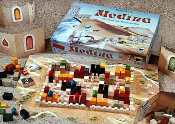 – nicht mehr lieferbar – bis 4 SpielerInnen Schwierigkeit Verpackung - 2. Platz Deutscher Spiele Preis 2001 Extra viel Holz verspricht Medina auf der Schachtel. Denn diese orientalische Altstadt wird aus Massivholz-Spielsteinen aufgebaut. So ist auf alle Fälle ein optisches Highlight versprochen, denn das Entstehen der Gebäude auf dem Spielbrett ist wahrlich schön anzuschauen. Gebaut werden Paläste in vier Farben. Wobei jede SpielerIn am Ende nur jeweils einen Palast in einer Farbe besitzen darf. Außerdem darf gleichzeitig immer nur je ein Palast einer Farbe in Bau sein. Das heißt, dass alle SpielerInnen zunächst zusammen die Paläste aufbauen. Palast-Spielsteine gleicher Farbe müssen dann unmittelbar angrenzend verbaut werden, damit sie zusammen einen ständig größer werdenden Palast darstellen. Dort wird der braune Palast gebaut, in der anderen Ecke der graue, hier der orange und dazwischen der scharze Palast. Dabei belauern sich die SpielerInnen. Irgendwann schlägt eine SpielerIn dann zu sie setzt ein Dach ihrer Farbe oben auf einen Palast. Der ist dann ihr Besitz und kann nur noch durch weiße Ziegeställe erweitert werden. Jetzt kann mit dem Bau eines neuen Palastes in dieser Farbe gestartet werden. Am Ende zählt die Größe der Paläste. Ein Plättchen mit Bonuspunkten erhält, wer den größten Palast einer Farbe baut. Außerdem wird in der Mitte ein Weg mit Spielfiguren gebaut und am Rand die Stadtmauer. Paläste die den Weg oder die Mauer berühren, bringen Zusatzpunkte. Stefan Dorra (Linie 1) und Hans im Glück hat mit Medina ein außerordentlich schönes Spiel auf den Markt gebracht, dass bei einfachen Regeln taktisch-strategisch reichlich anspruchsvoll ist und auf einen bestimmenden Glücksfaktor verzichtet. Medina erinnert entfernt an Torres, dem Spiel des Jahres 2000. Das mag ein Grund für die Kritikerpreis-Jury gewesen zu sein, dem Titel eine Aufnahme in die Auswahlliste zu verwehren. Denn Medina ist nicht unbedingt etwas für die breite Käufermasse. Längere Denkpausen können den Spielfluss erheblich mindern müssen aber nicht. Wer will, kann sich von dem bildschönen Material auch zu einer locker-leichten Spielrunde leider fehlt eine Zwei-Personen-Regel eingeladen fühlen. Der Spielekritiker Michael Knopf formuliert es in der spielbox so: Medina ist zwar was für Tüfler oder kann zur Tüftlerarbeit umfunktioniert werden, aber es enhält doch genügend Unwägbarkeiten und Zwänge, um nicht in Richtung Geistesakrobatik abzudriften. [ Pöppelkiste: