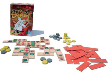 In der ersten Auflage des Spiels ist eine Stanzbogen doppelt vorhanden, während ein anderer fehlt (für den es bei Queen Ersatz gibt). Das hätte ich wahrscheinlich gar nicht bemerkt, da die Anleitung etwas maulfaul ist und weder die Zahl der Ratten noch der Gewürze verrät. Leider gibt es auch keine Auskunft über die Namen der abgebildeten rattenscharfen und exotischen Gewürze. Trotzdem ist Rattenscharf, das zuvor mit dem Titel Dschunke – Das Legespiel als Download auf Michael Schachts Website erschienen ist, ein empfehlenswertes Zwei-Personen-Spiel für gut 15 Minuten Spielspaß.