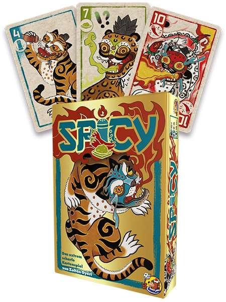 Die Spicy-Karten haben drei „scharfe“ Farben – Chili, Pfeffer, Wasabi – und Zahlen zwischen 1 und 10. Begonnen wird mit einer 1, 2 oder 3, anschließend muss eine höhere Karte derselben Farbe draufgelegt werden. Sobald eine 10 liegt, beginnt es wieder mit 1, 2 oder 3 derselben Farbe. Man legt seine Spielkarten nicht offen ab, sondern verdeckt. Genau das sorgt für den Spielspaß, der bei Spicy gar nicht so sehr im Mechanismus begründet ist, sondern in der Kommunikation der Mitspielenden. Hier wird geblufft und gelogen, dass es eine Freude ist. Nicht so gut läuft Spicy, wenn die alle zu ehrlich sind und lieber eine Karte vom Nachziehstapel nehmen, statt zu lügen. Das ist aber außerordentlich selten. Spicy spielt sich wunderbar locker und flott, sehr gut gerade auch in größerer Runde zu fünft.
